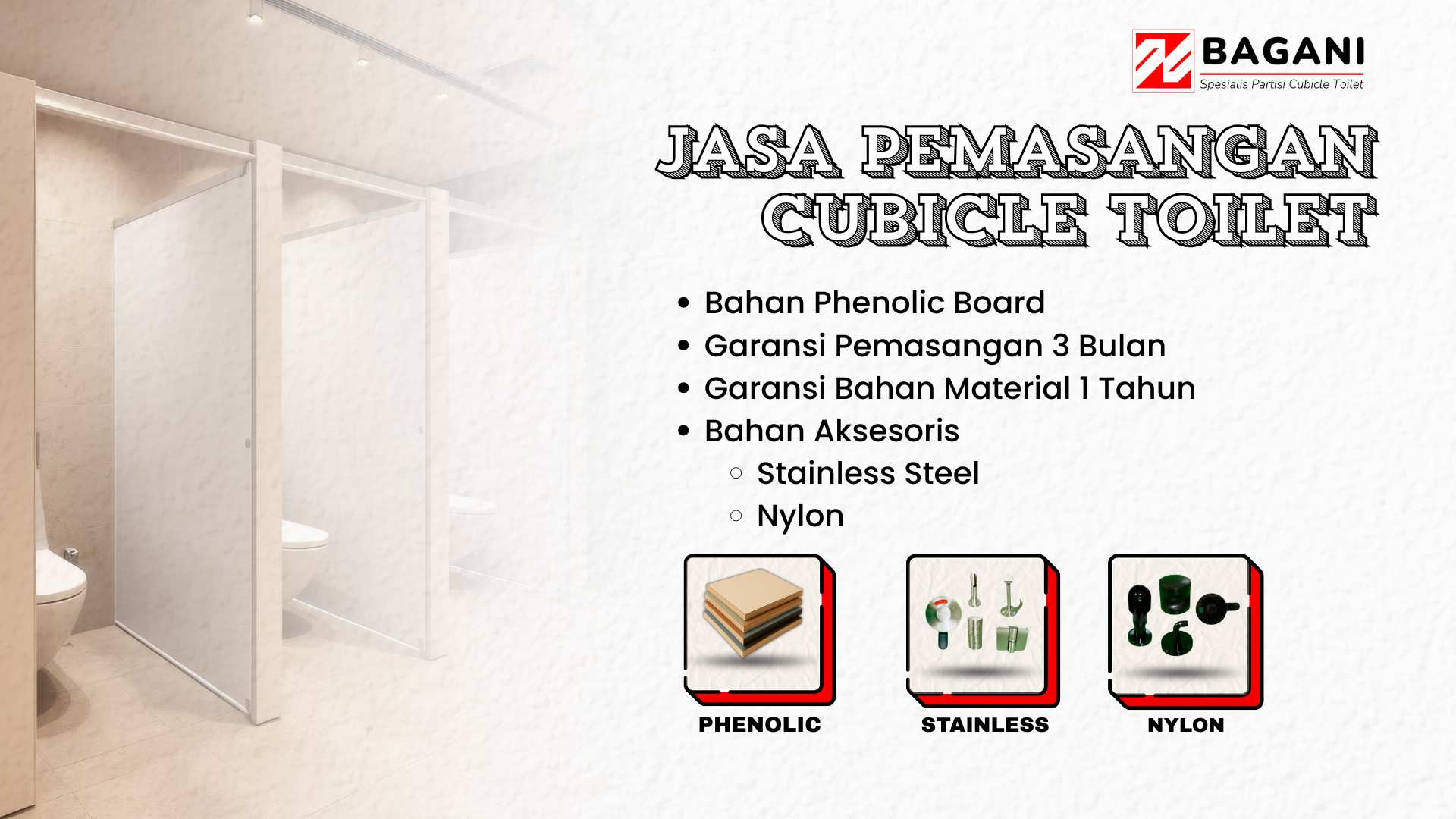 PT Bagani Citra Mandiri adalah perusahaan spesialis yang bergerak di bidang solusi partisi toilet dan cubicle toilet. Kami hadir untuk memenuhi kebutuhan proyek cubicle Anda. Layanan kami mencakup properti komersial, fasilitas publik, perkantoran, hingga institusi dengan fokus pada durabilitas material.